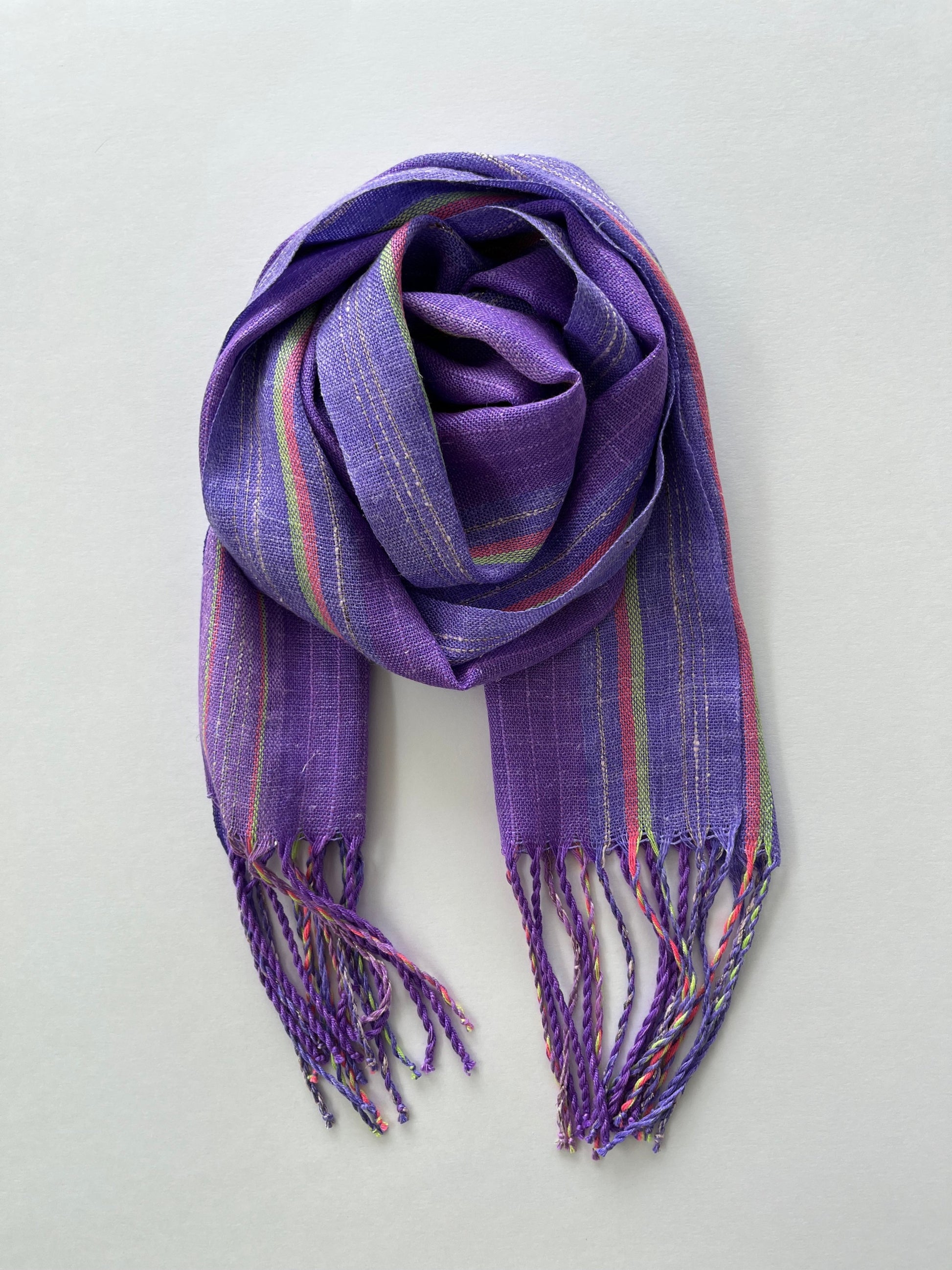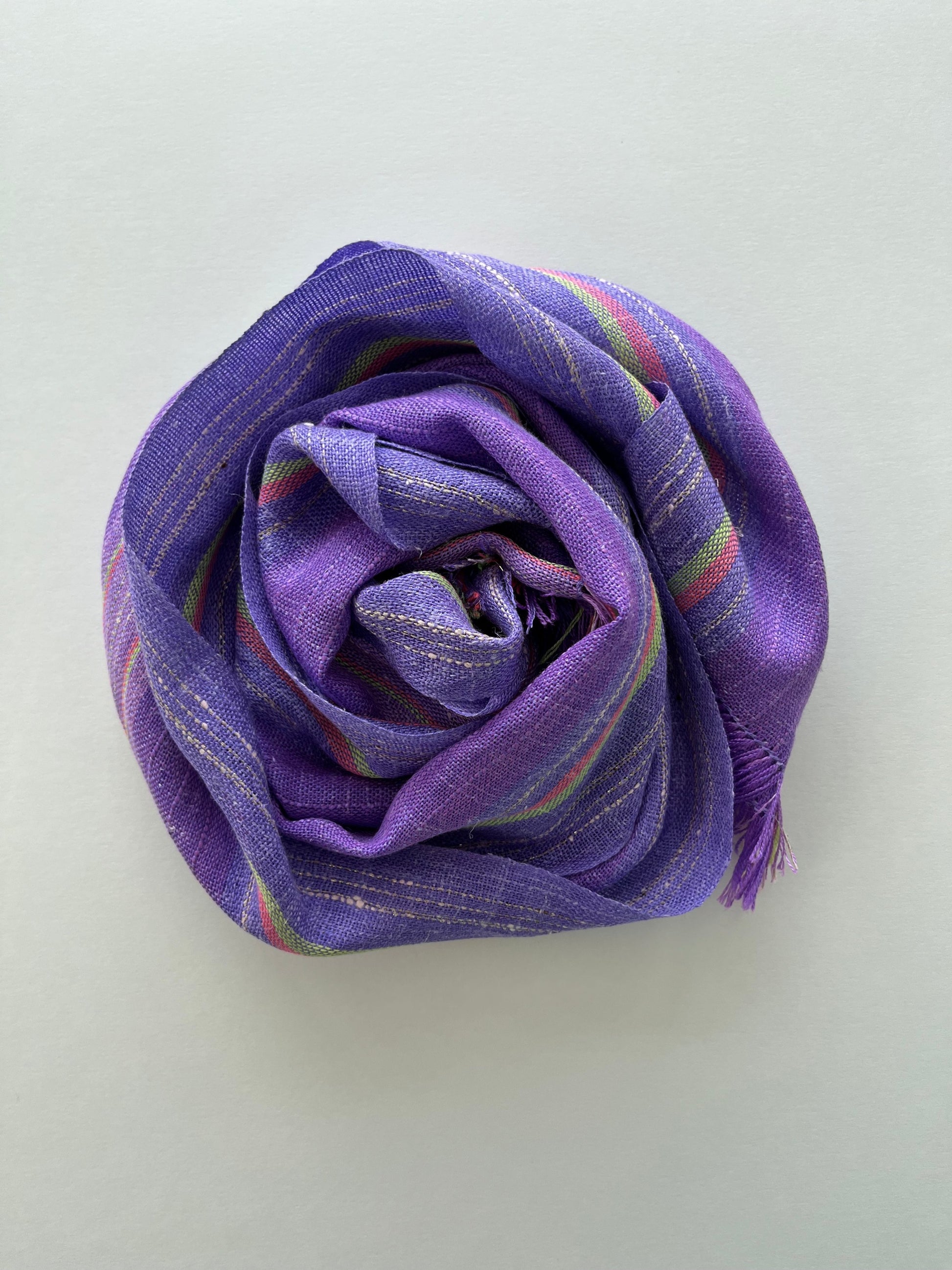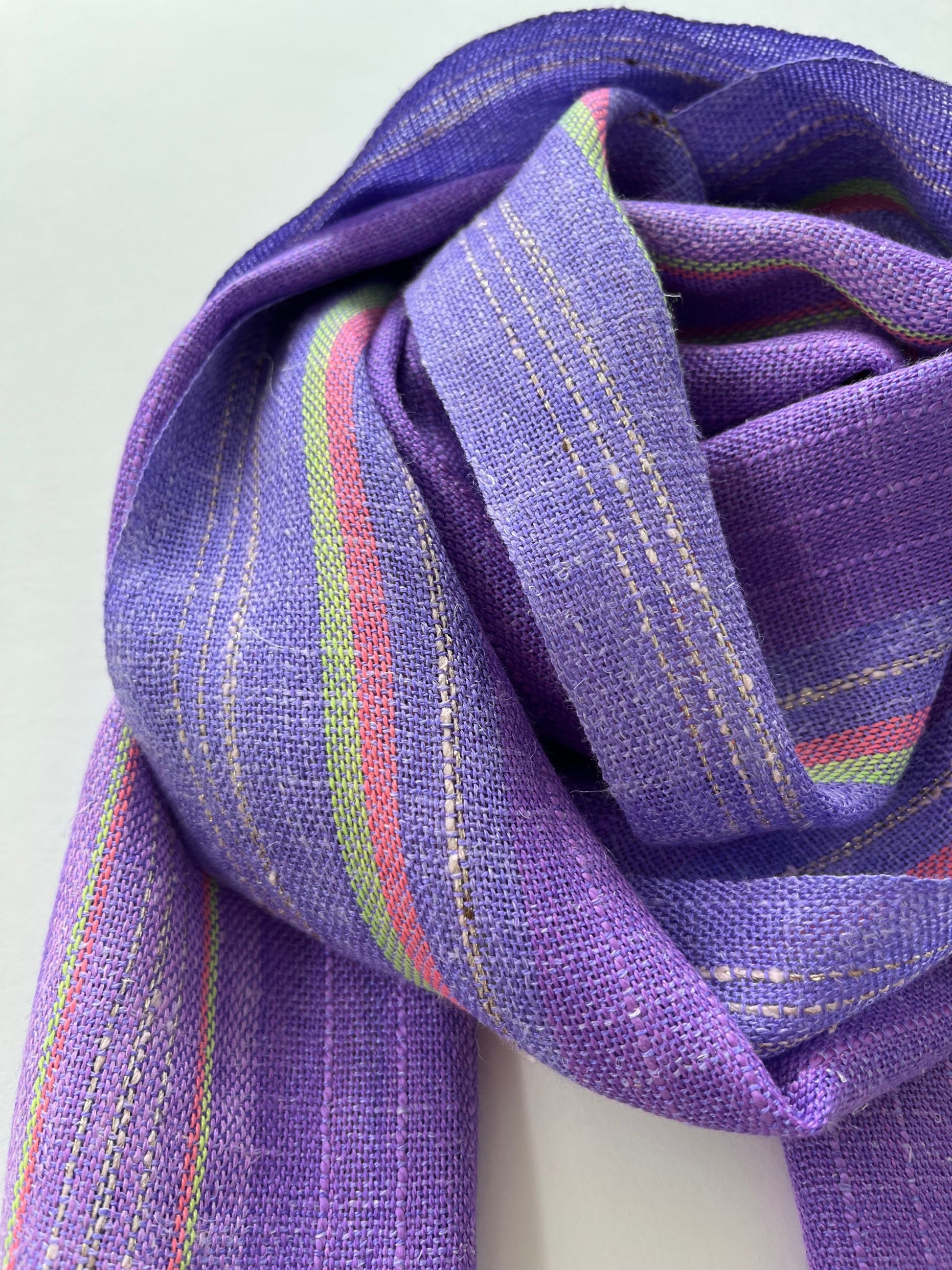 Within the vertical stripes of colour in the warp there is a subtle gradient of hue intensity, pops of contrasting colours and just a touch of sparkle. When worn, these differing textures and colours create a beautiful visual interplay that interacts differently with every wear. Several yarns are used in this design, resulting in a unique combination of silk, linen and merino wool.