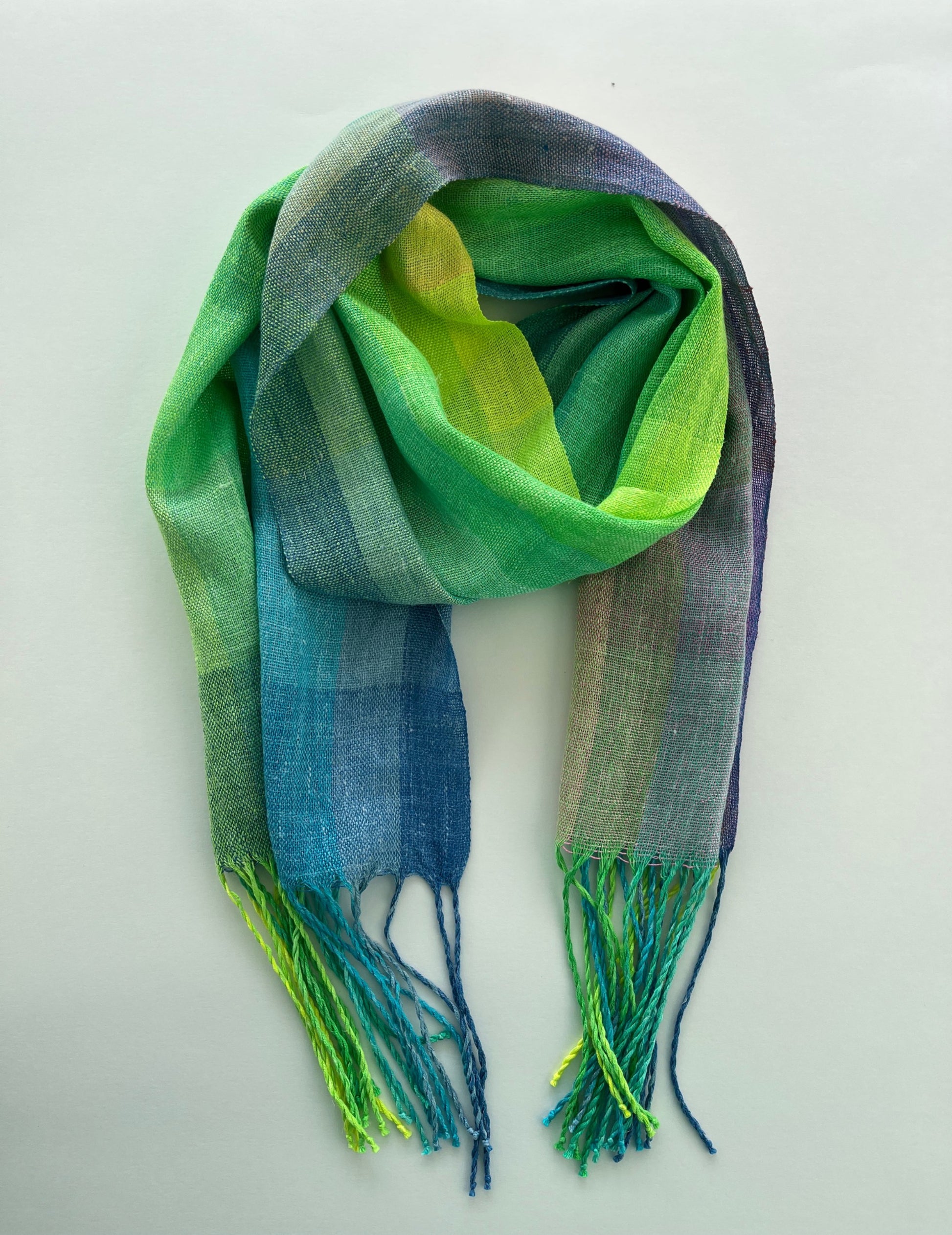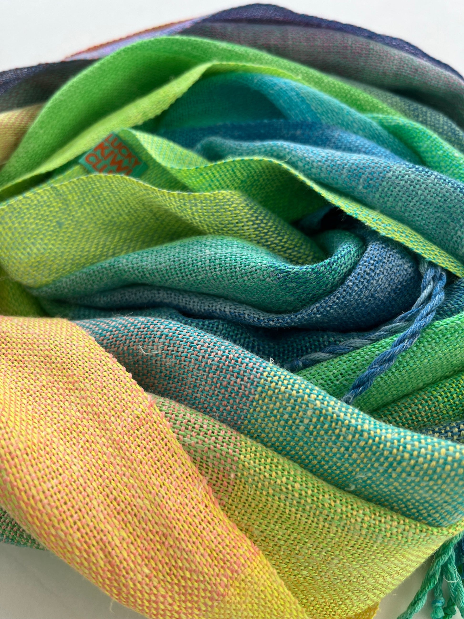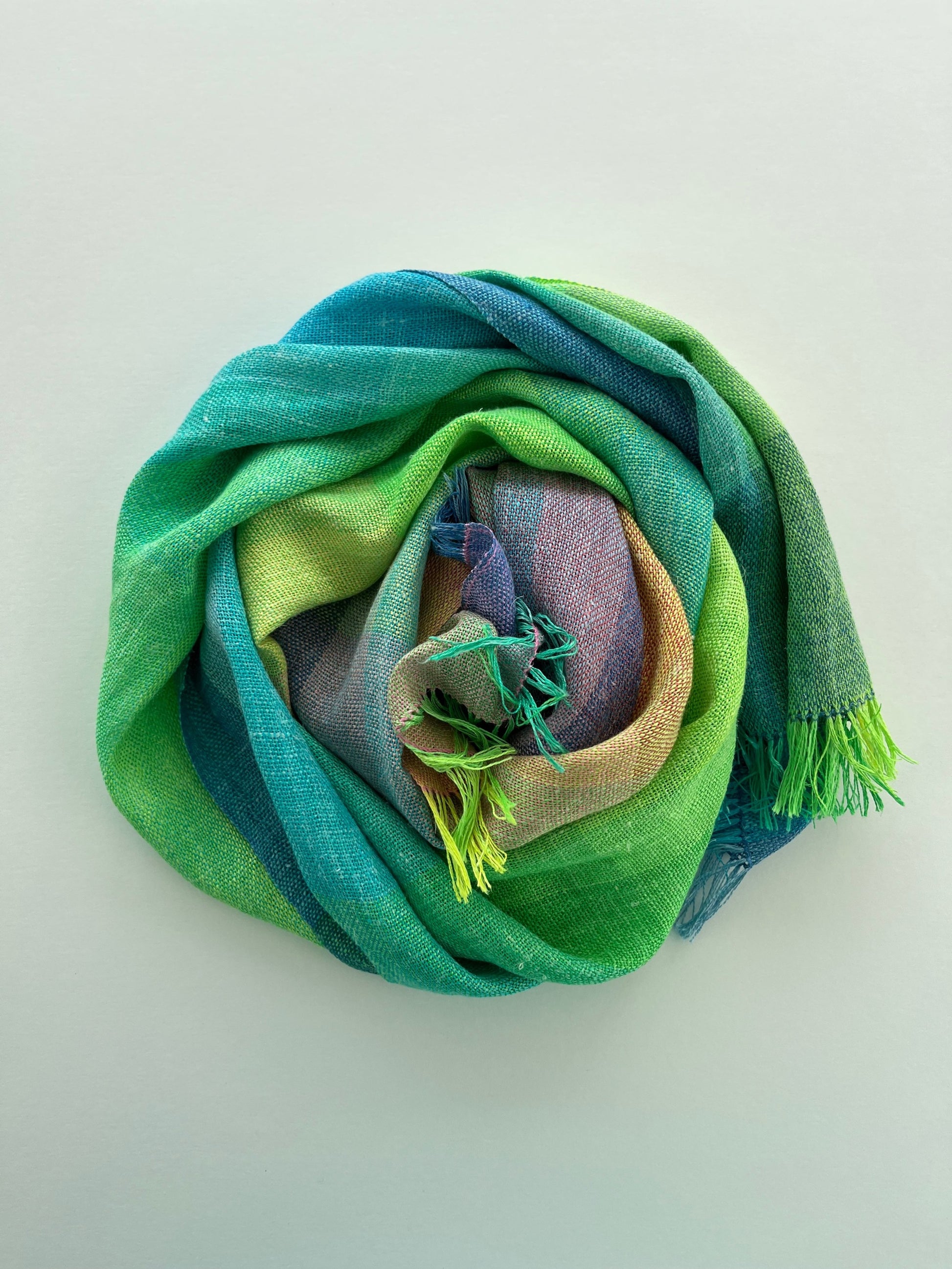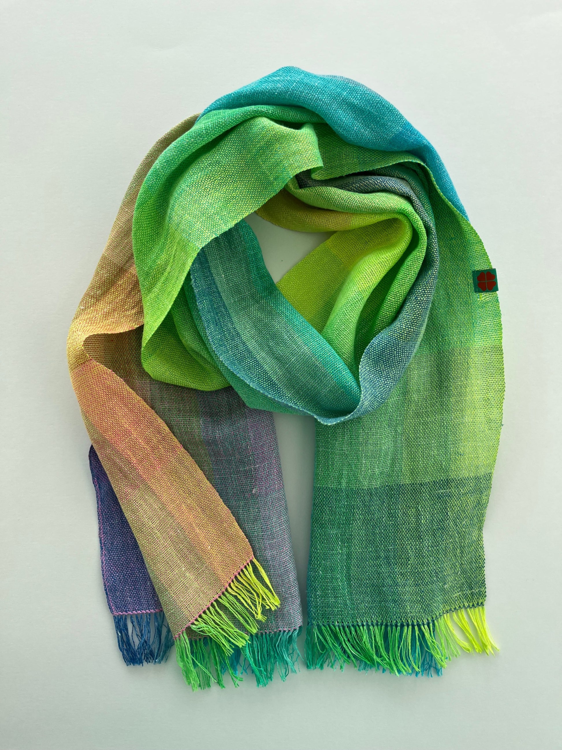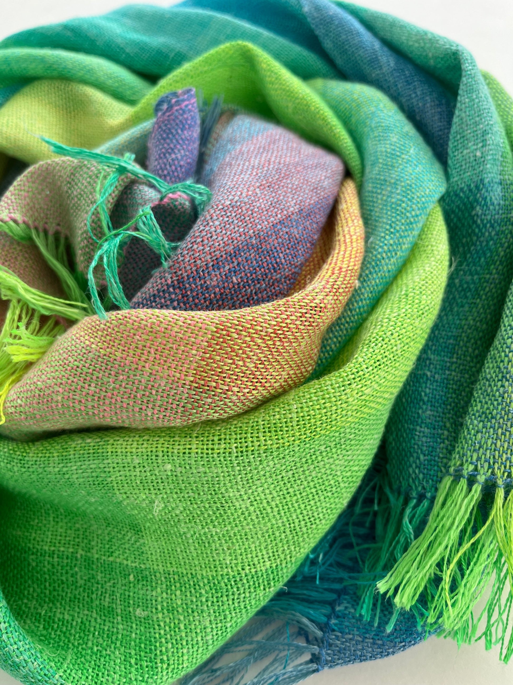 The colour differences in the title refer to the colour transition in the warp. Each combination changes the overall tone of the scarf, delicately shifting the rainbow colour story of the scarf. This scarf is bright turquoise to fluorescent yellow.