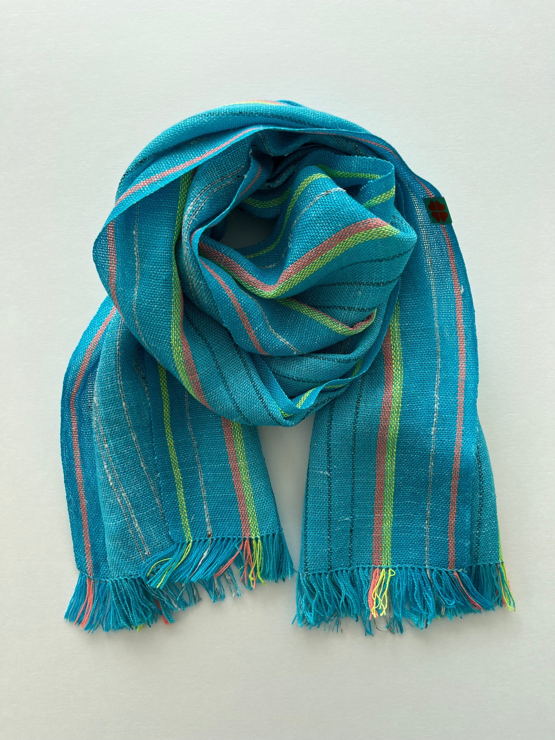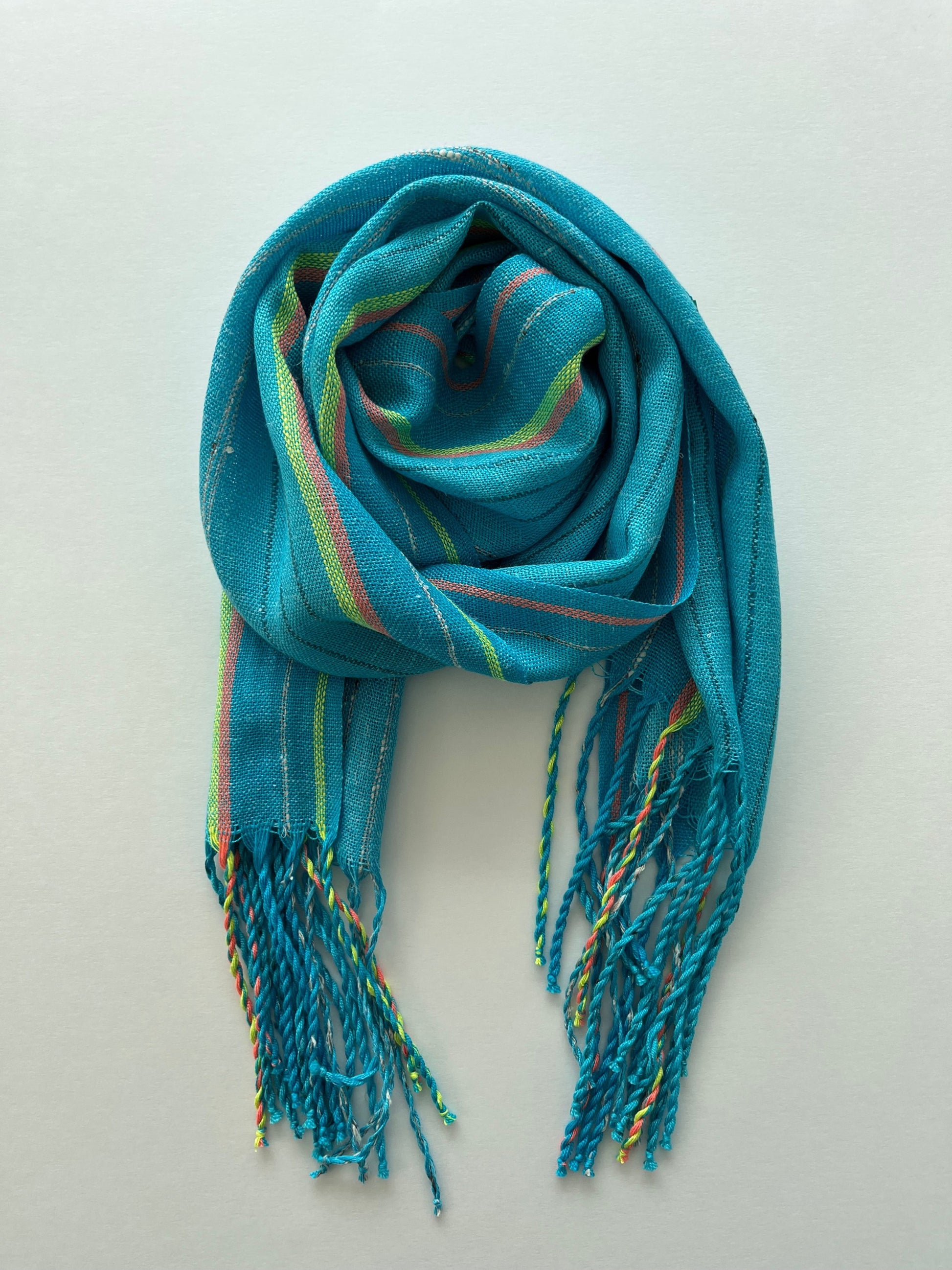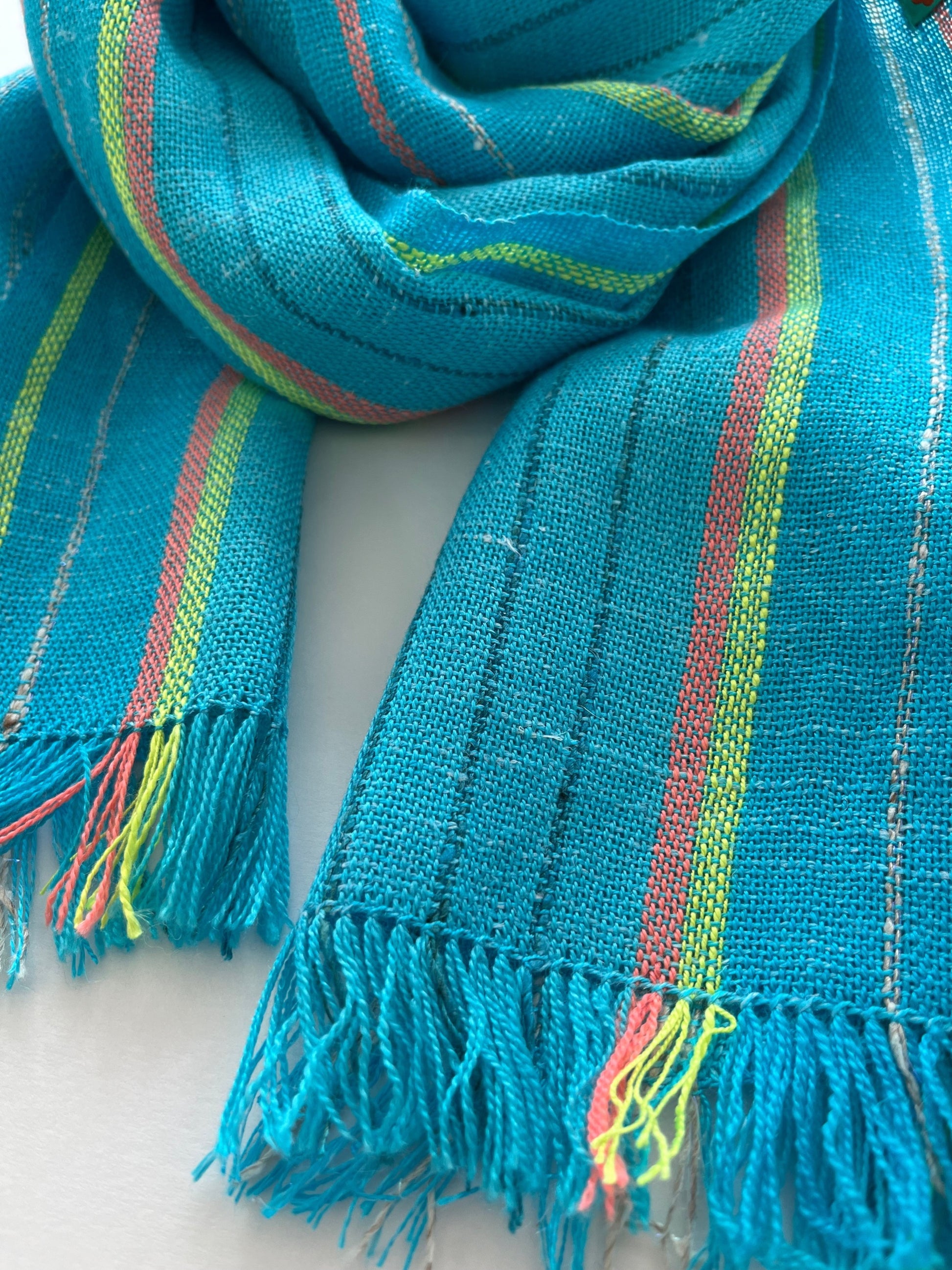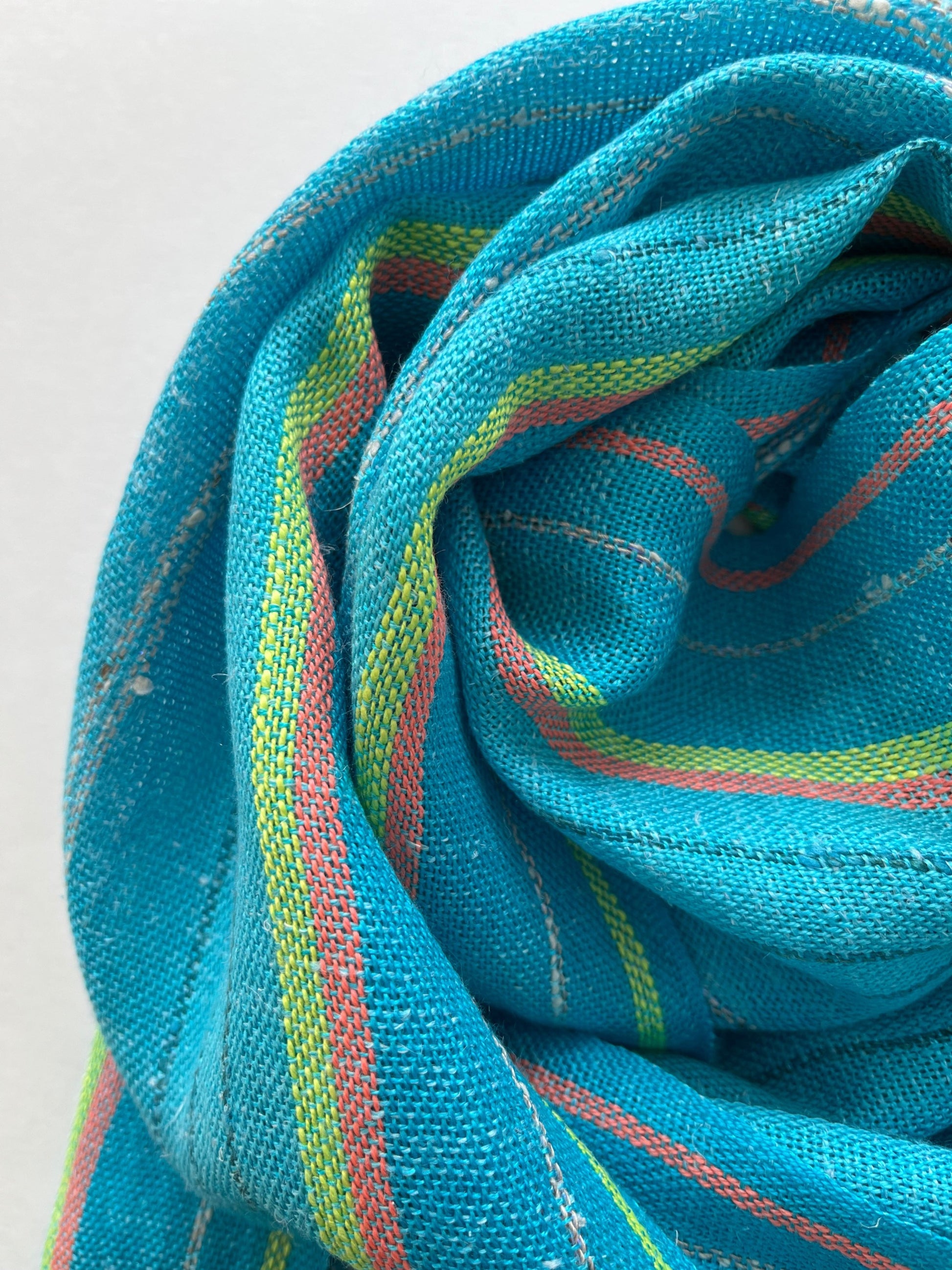 Within the vertical stripes of colour in the warp there is a subtle gradient of hue intensity, pops of contrasting colours and just a touch of sparkle. When worn, these differing textures and colours create a beautiful visual interplay that interacts differently with every wear. Several yarns are used in this design, resulting in a unique combination of silk, linen and merino wool.